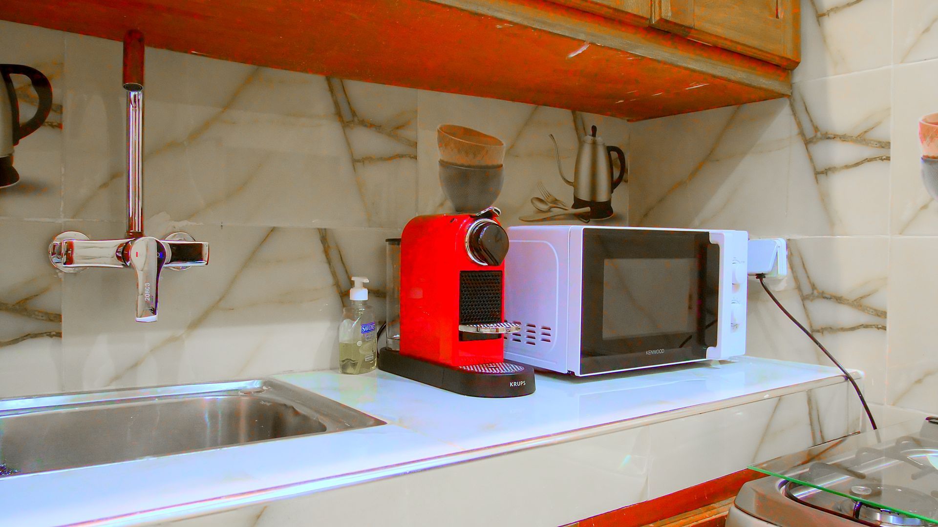 Dans la cuisine, nous avons une cuisinière, une machine à café, une bouilloire, un chauffe-eau, un micro-onde, un frigo et des ustensiles de cuisine.